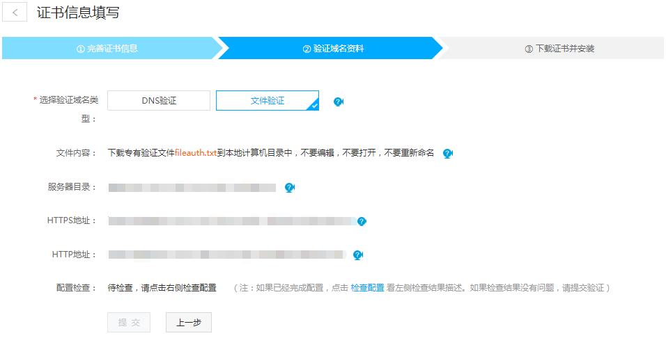 如下,可选择文件验证或DNS验证,推荐选择文件验证。因DNS解析生效需一定时间,解析后立即验证可能失败,请解析1-10后再验证