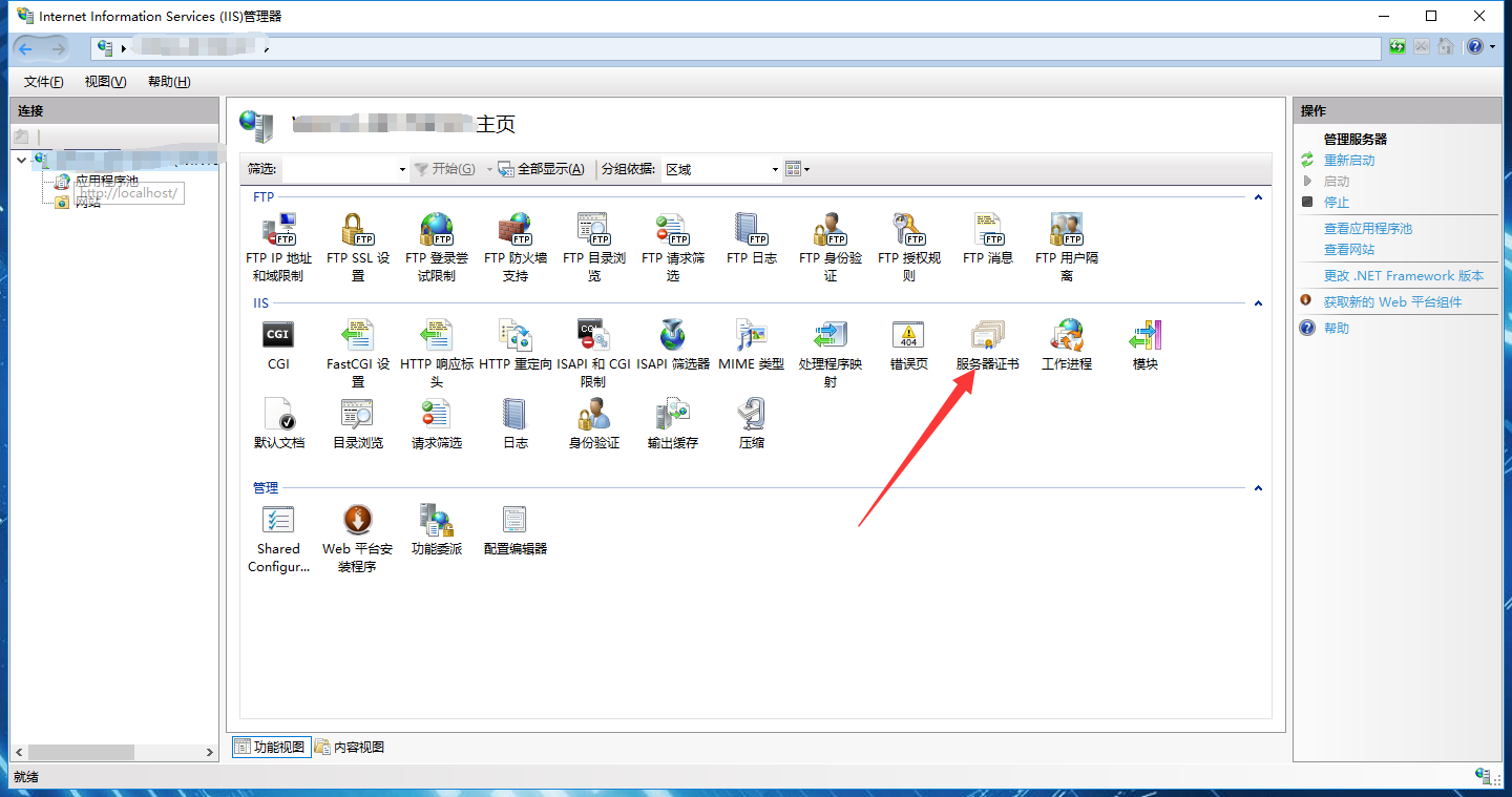 ① 打开iis,选择服务器证书