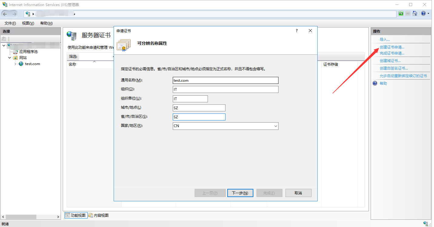 ① 打开iis-服务器证书,选择完成证书申请