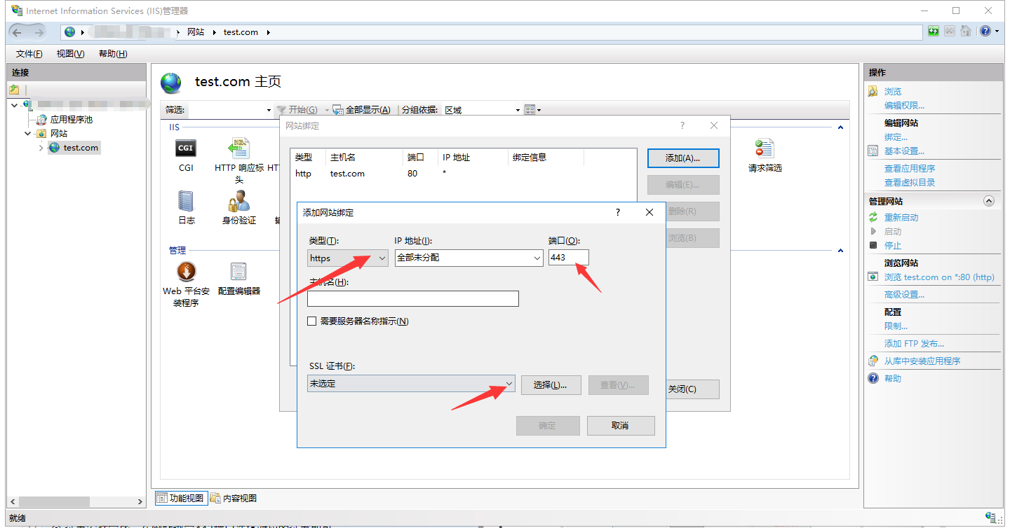 ③ 证书安装完毕,在网站绑定443端口选择对应的证书即可