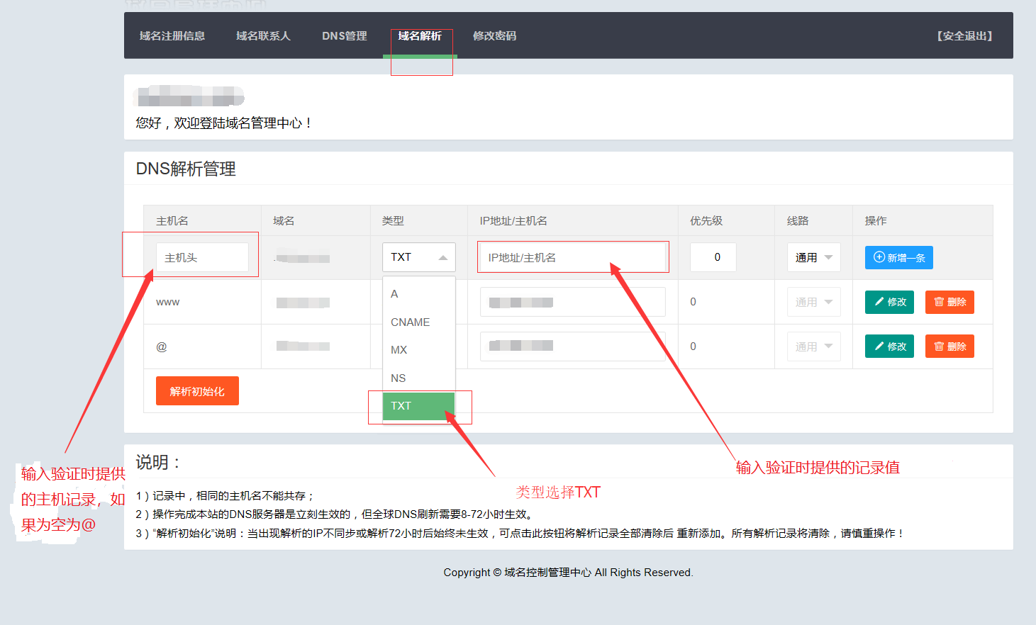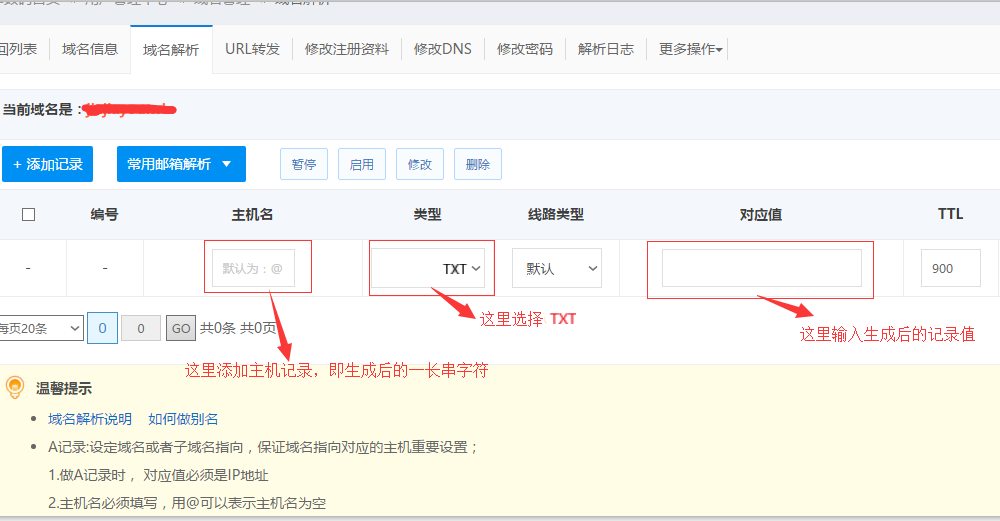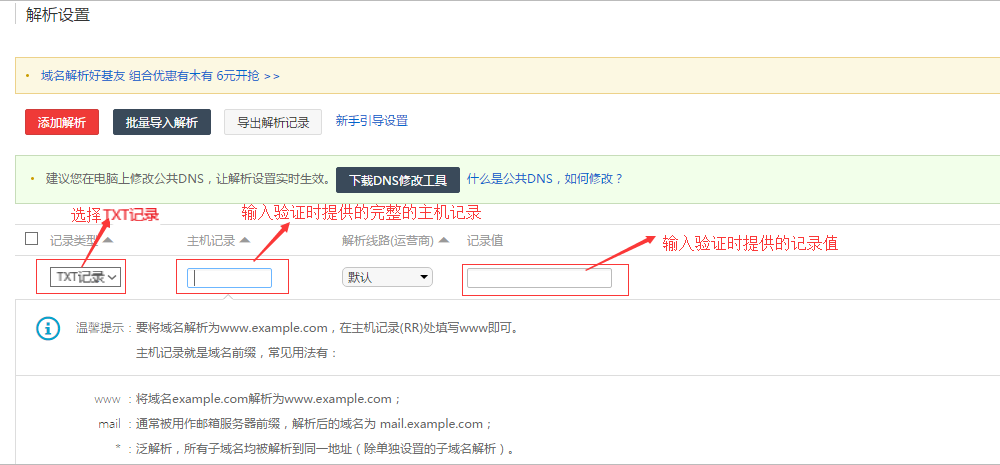 1元SSL证书DNS验证在各主流域名注册商下的域名解析方法,仅供参考。 账户下的域名解析方法:如图,在主机记录中输入ssl验证时获取到的一长串主机记录,包括网址信息,将记录类型选择为TXT,在记录值(IP/域名)中输入ssl验证时获取的一串记录值。 ![]() 易名账户下的域名解析方法:如图,在主机记录中输入ssl验证时获取到的一长串主机记录,包括网址信息,将记录类型选择为TXT,在记录值(IP/域名)中输入ssl验证时获取的一串记录值。 ![]() 阿里云账户下的域名解析方法:找到需要域名,如图,将记录类型选择为TXT,在主机记录中输入ssl验证时获取到的一长串主机记录,包括网址信息,在记录值中输入ssl验证时获取的一串记录值。 ![]() 新网账户下的域名解析方法:如图,将记录类型选择为TXT,在主机记录中输入ssl验证时获取到的一长串主机记录,不包括网址信息,在对应值中输入ssl验证时获取的一串记录值。 ![]() 西部数码账户下的域名解析方法:如图,在主机名中输入ssl验证时获取到的一长串主机记录,包括网址信息,将记录类型选择为TXT,在对应值中输入ssl验证时获取的一串记录值。 ![]() 更多域名解析方法,请详询您的域名注册商。 |