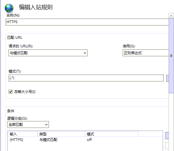 安装“URL REWRITE2 ” 伪静态模块IIS7需要先确认是否安装 “URL REWRITE2 ” 伪静态模块 , 如果您已经安装可以跳过 下载地址 : http://www.iis.net/downloads/microsoft/url-rewrite 选择站点URL 重写,如果安装的是英文版的 应该是【Url rewrite】 添加 “ 空白规则”添加规则名称 : HTTPS 匹配URL 模式: (.*) 添加条件: 条件: {HTTPS} 模式: off 操作类型选择:重定向 重定向URL:https://{HTTP_HOST}/{R:1} 然后保存即可 高级版直接把伪静态添加到web.config <?@xml version="1.0" encoding="UTF-8"?> <configuration> <system.webServer> <rewrite> <rules> <rule name="HTTP to HTTPS redirect" stopProcessing="true"> <match url="(.*)" /> <conditions> <add input="{HTTPS}" pattern="off" ignoreCase="true" /> </conditions> <action type="Redirect" redirectType="Found" url="https://{HTTP_HOST}/{R:1}" /> </rule> </rules> </rewrite> </system.webServer> </configuration> |