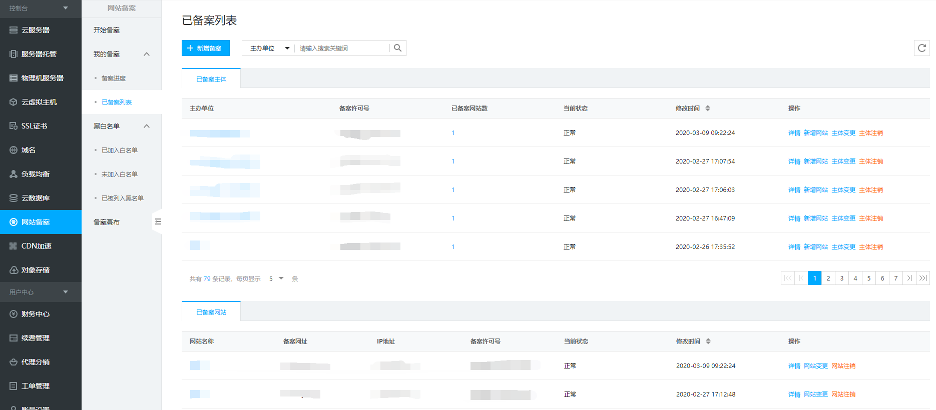 备案注销操作步骤1.登录控制台-网站备案-我的备案-已备案列表。