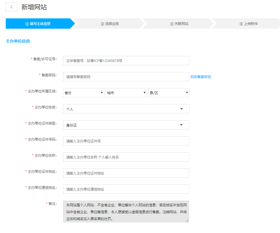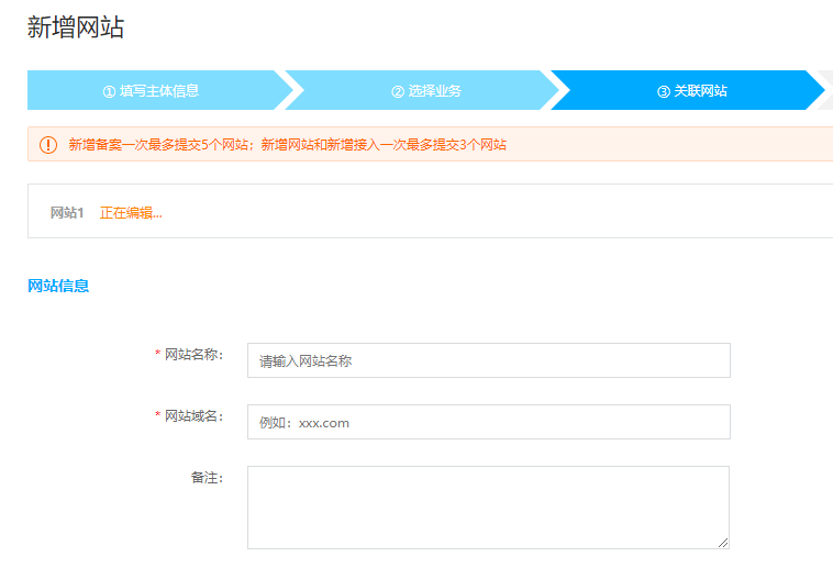 原备案不在我司的增加网站:主办者证件号码已在其他接入商处取得备案号,域名未取得备案号,想做增加新网站操作,操作步骤如下。