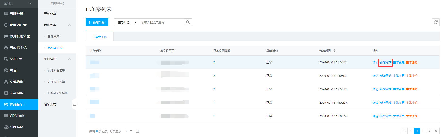 2、左边框栏点击网站备案,选择我的备案-已备案列表,在页面中查看到已经备案通过的备案,点击后面“新增网站”按钮