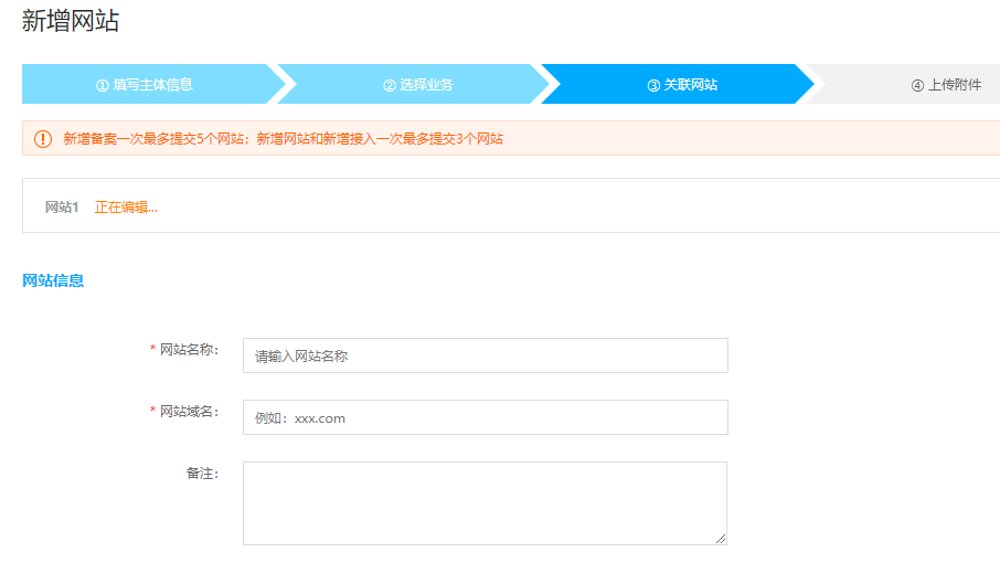 主办者证件号码已在我司取得备案号,此次需备案的域名未取得备案号,需做增加新网站操作,操作步骤如下。