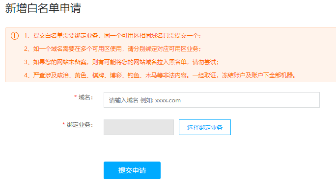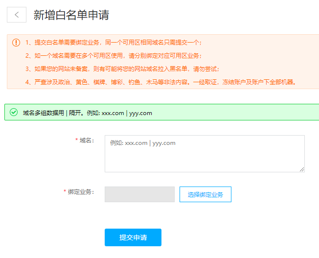 域名已经有备案记录,可以添加白名单直接使用,无需等待审核,提交即可解析使用。